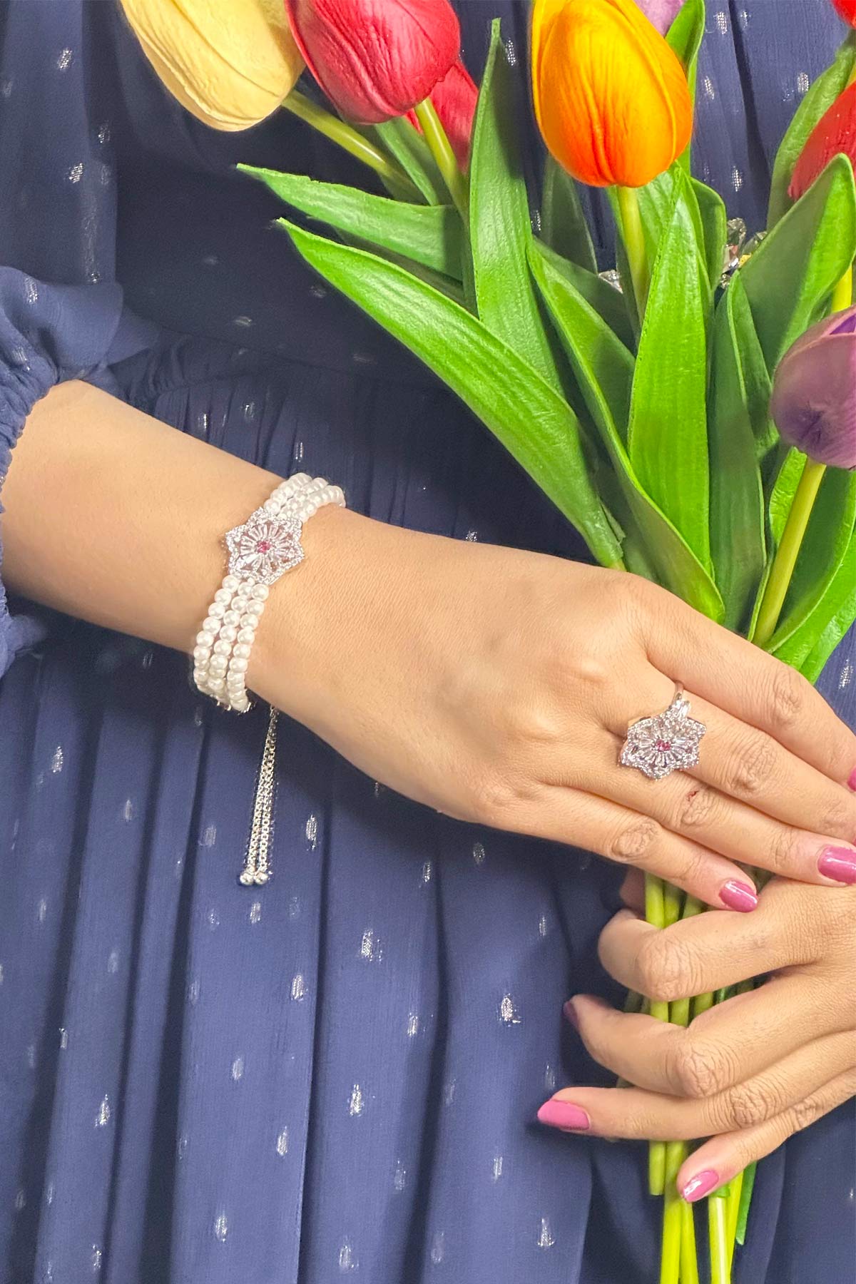 - Coordinated floral stud earrings and statement ring