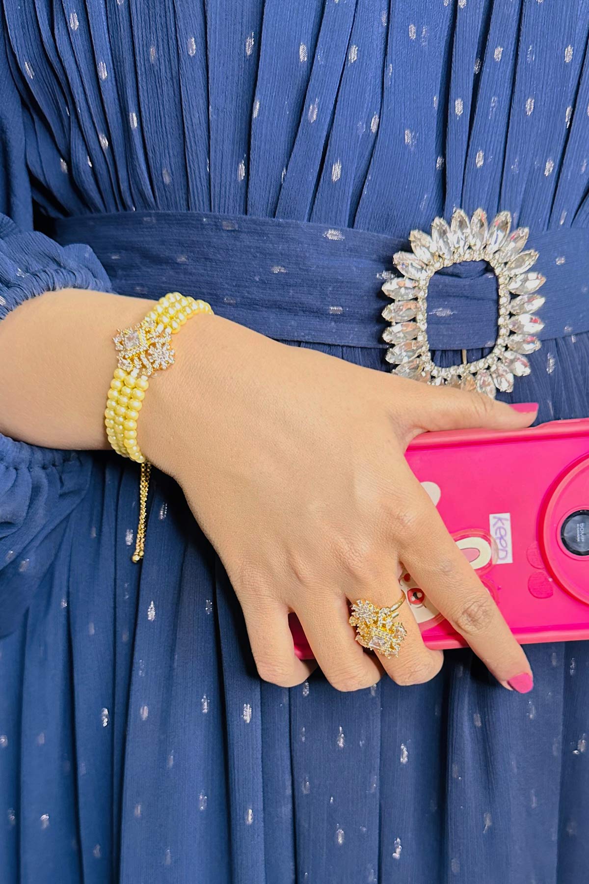 Elevate your look with this elegant gold and pearl jewelry set, designed with a sophisticated vintage charm. The set features a three-layer pearl choker adorned with a beautifully detailed gold centerpiece embellished with sparkling stones. The coordinating earrings and statement ring highlight the same intricate floral-inspired design, creating a perfectly matched and luxurious ensemble.