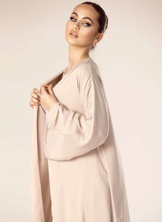 Cream Open Abaya with Navy Accents & Functional Pockets