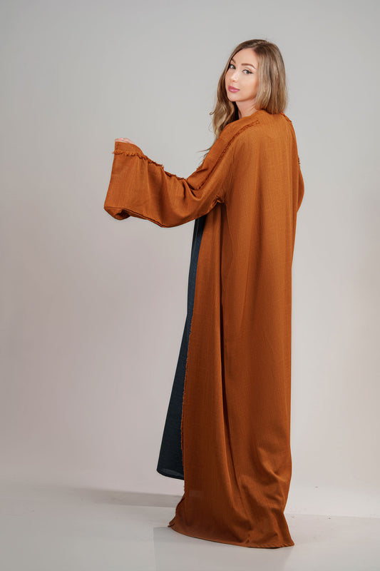 Rust Brown Open Bisht Abaya with Frayed Edge Detailing