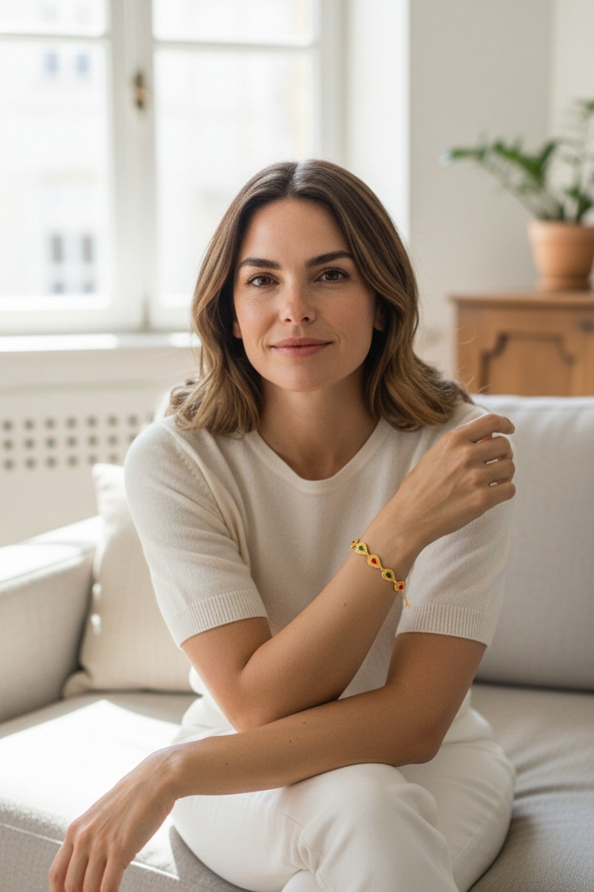 Style this bracelet with abayas, kaftans, or solid-color dresses to highlight its vibrant stone detailing and elegant gold finish.