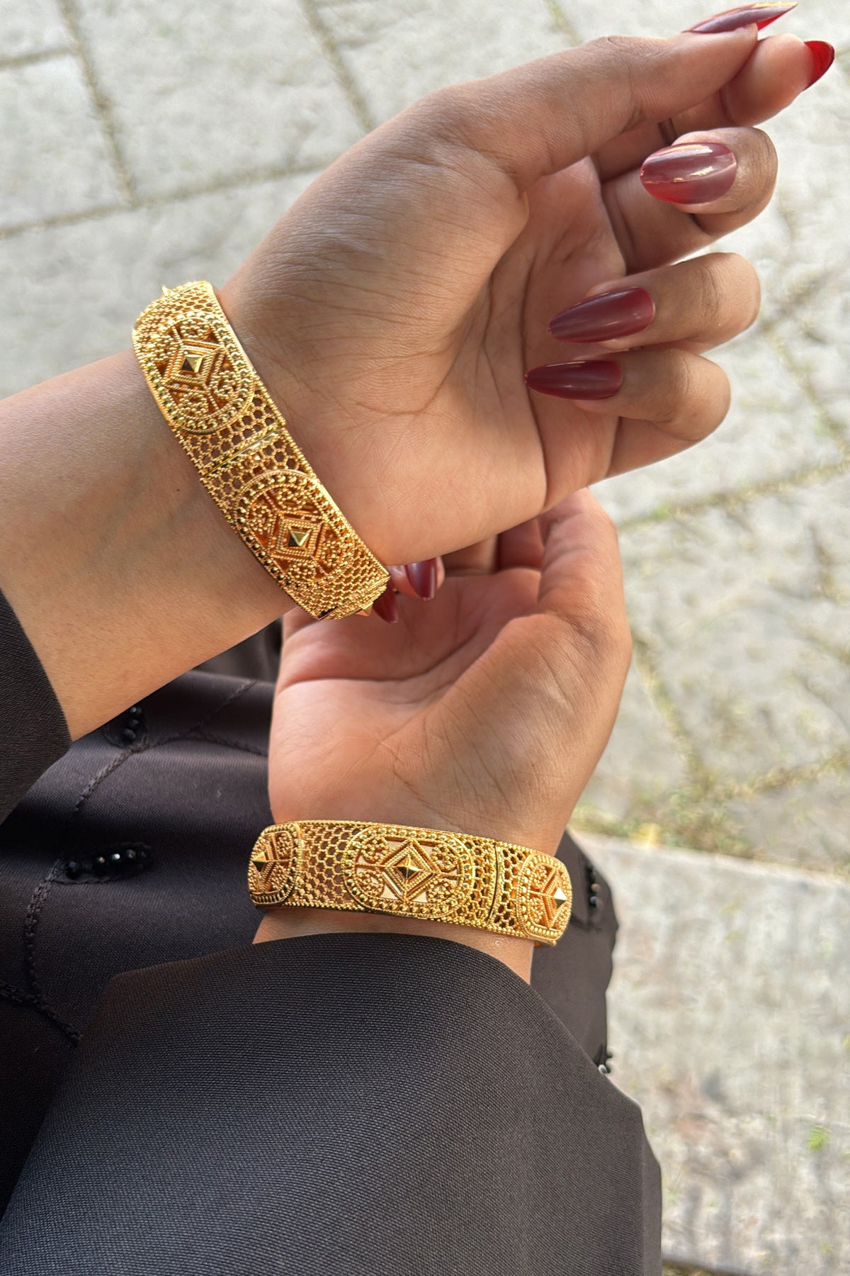 Fine crafted Reem Traditional Bangles set is a great choice for a strong and bold look. These are adjustable and can be wear on any hand size. These can be wear with cultural and traditional outfits. It is a pair of 2.