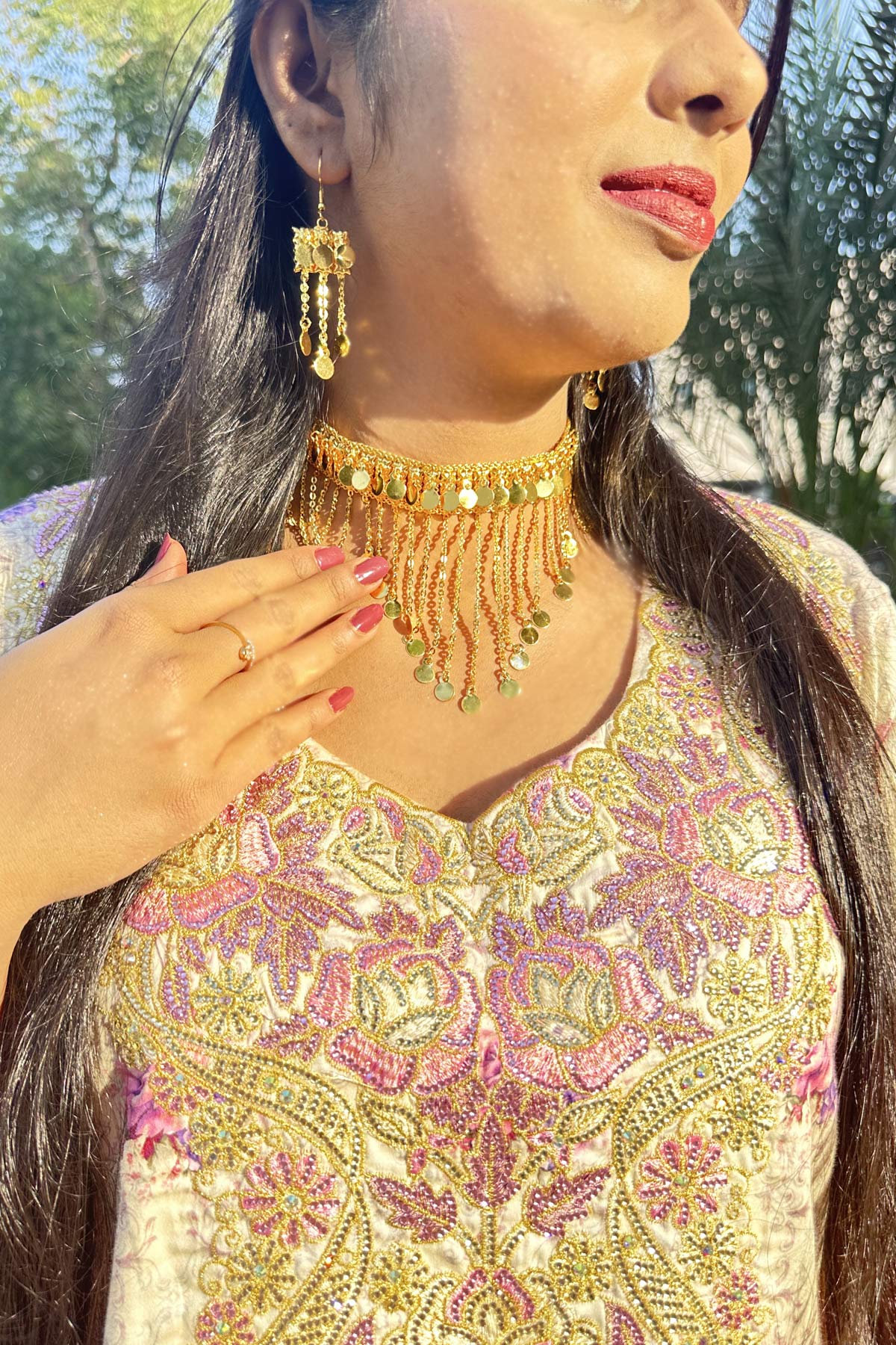 Elevate your look with this Khaleeji-style gold plated choker necklace, a dazzling statement piece inspired by the elegance and opulence of Gulf Arab jewelry traditions. Designed with intricate dangling coin chains and a bold gold shine, this necklace embodies the glamour and grace of modern Arabian fashion.