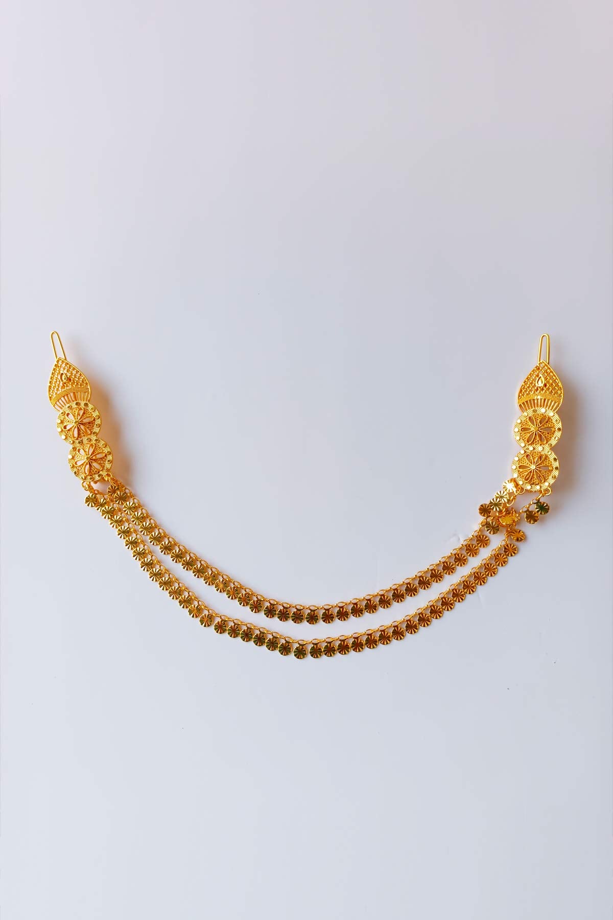Add a touch of timeless elegance to your hairstyle with these beautifully crafted gold-tone hair pins, designed with intricate floral detailing and triple hanging chains for a graceful draped effect. Perfect for traditional hairstyles, party looks, and bridal styling, these decorative hair pins instantly elevate any outfit with their shimmering gold finish and delicate craftsmanship. Lightweight, secure, and easy to wear, they are the perfect accessory to complete your festive or cultural look.
