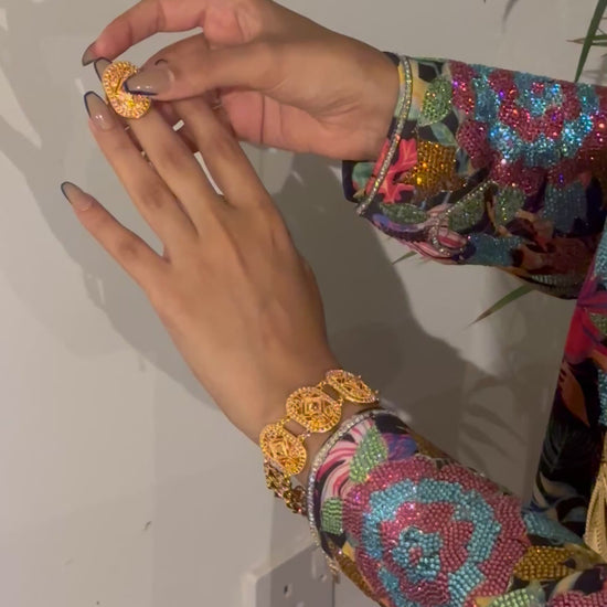 This stunning traditional gold-plated bracelet and matching ring set, crafted with intricate floral carving and a rich antique finish. The bracelet features a bold geometric link pattern and three elegant floral motifs at the center, complemented perfectly by the coordinating statement ring. Lightweight yet eye-catching, this artificial jewelry set adds a regal touch to your festive and wedding wear.