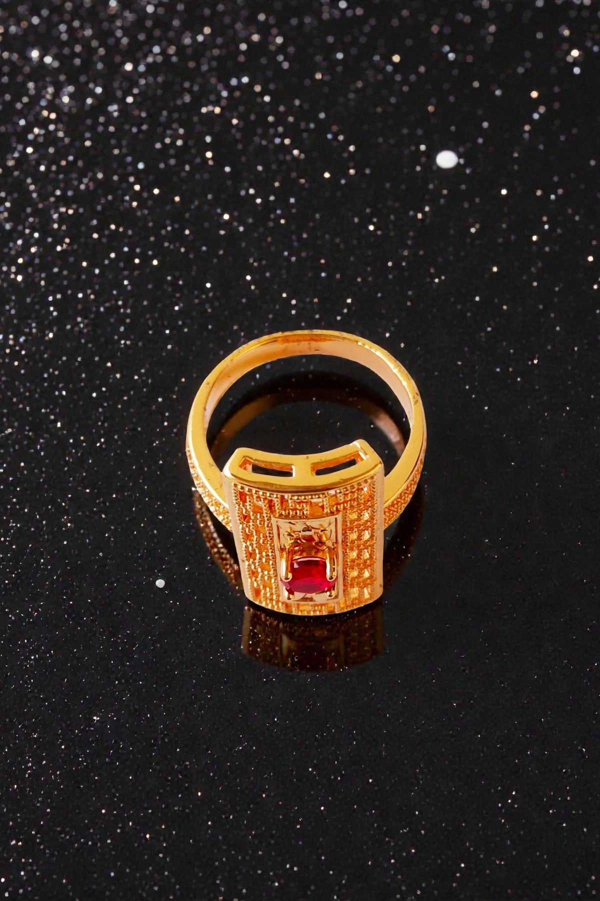 Make a bold style statement with this stunning adjustable ring, designed with a unique rectangular face featuring intricate ethnic patterns. At the center sits a vibrant red stone, adding a pop of color and sophistication to your look.