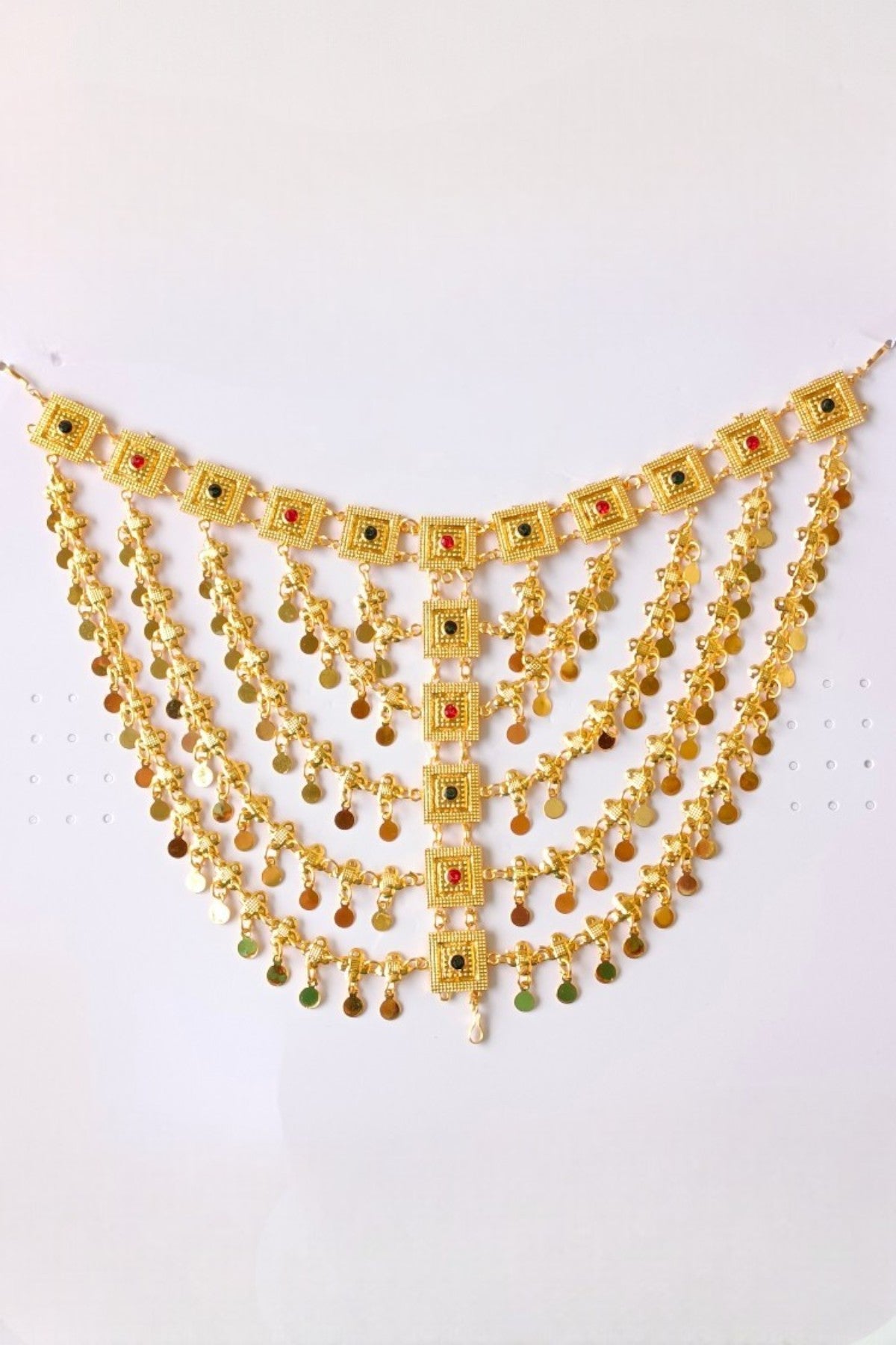 Add a touch of luxury to your look with this elegant gold head jewelry, designed with intricate detailing and cascading coin chains. The delicate geometric patterns and shimmering discs create a graceful statement piece that beautifully frames the face. Perfect for weddings, cultural events, photoshoots, and special occasions, this headpiece combines traditional artistry with modern elegance.