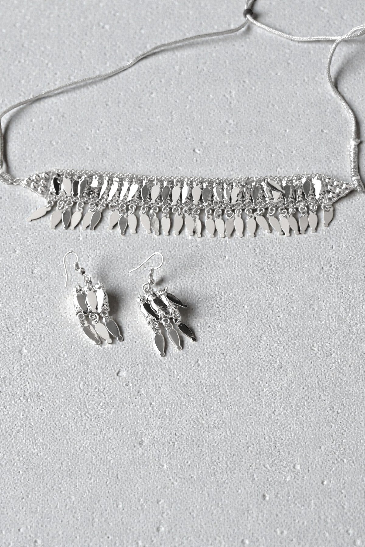 This silver finish choker necklace and earrings set features a bold traditional design accented with dangling coin-shaped charms that create graceful movement and a statement ethnic look. Crafted in an artificial metal alloy with a polished silver-tone finish, this lightweight jewelry set is ideal for festive occasions, cultural events, and modern ethnic styling.