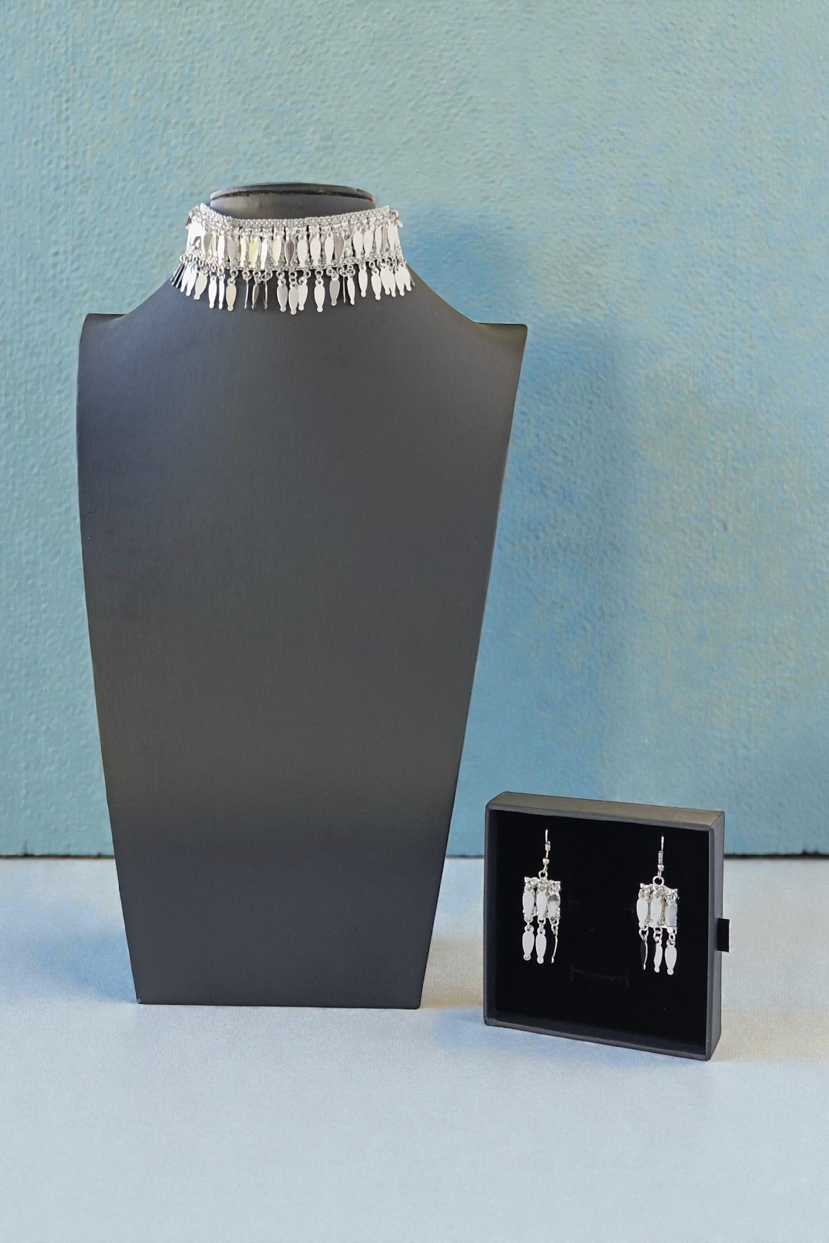 - Includes silver-tone choker necklace and matching earrings