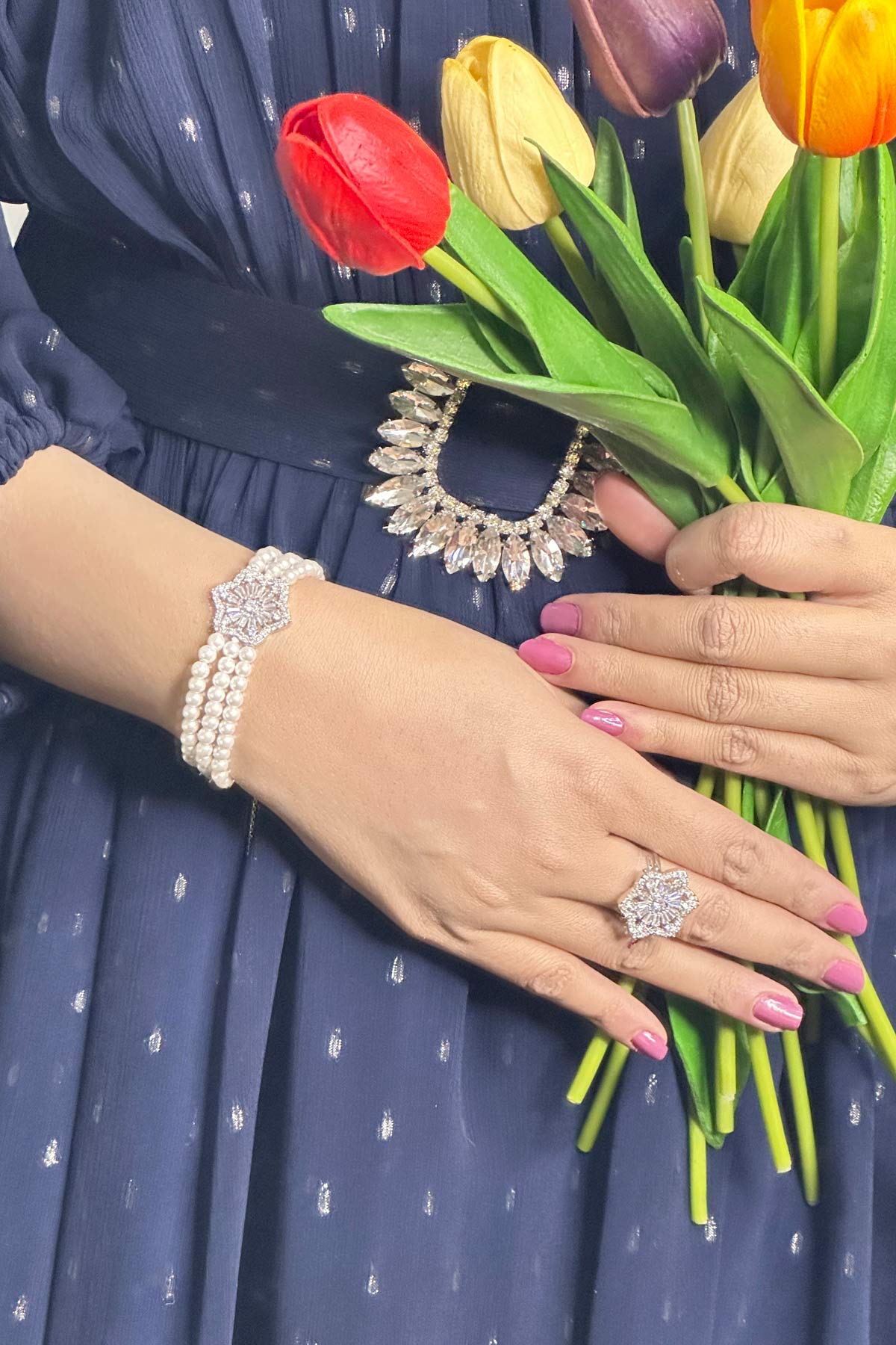The choker is crafted with multiple rows of pearls for a rich, classic finish, while the floral centerpiece adds a touch of sparkle with its crystal-like stones and a hint of color at the center. The matching bracelet mirrors the choker’s pearl strand design, creating a perfect wrist accent. The statement ring completes the set, making it ideal for formal events, weddings, parties, and festive occasions.
