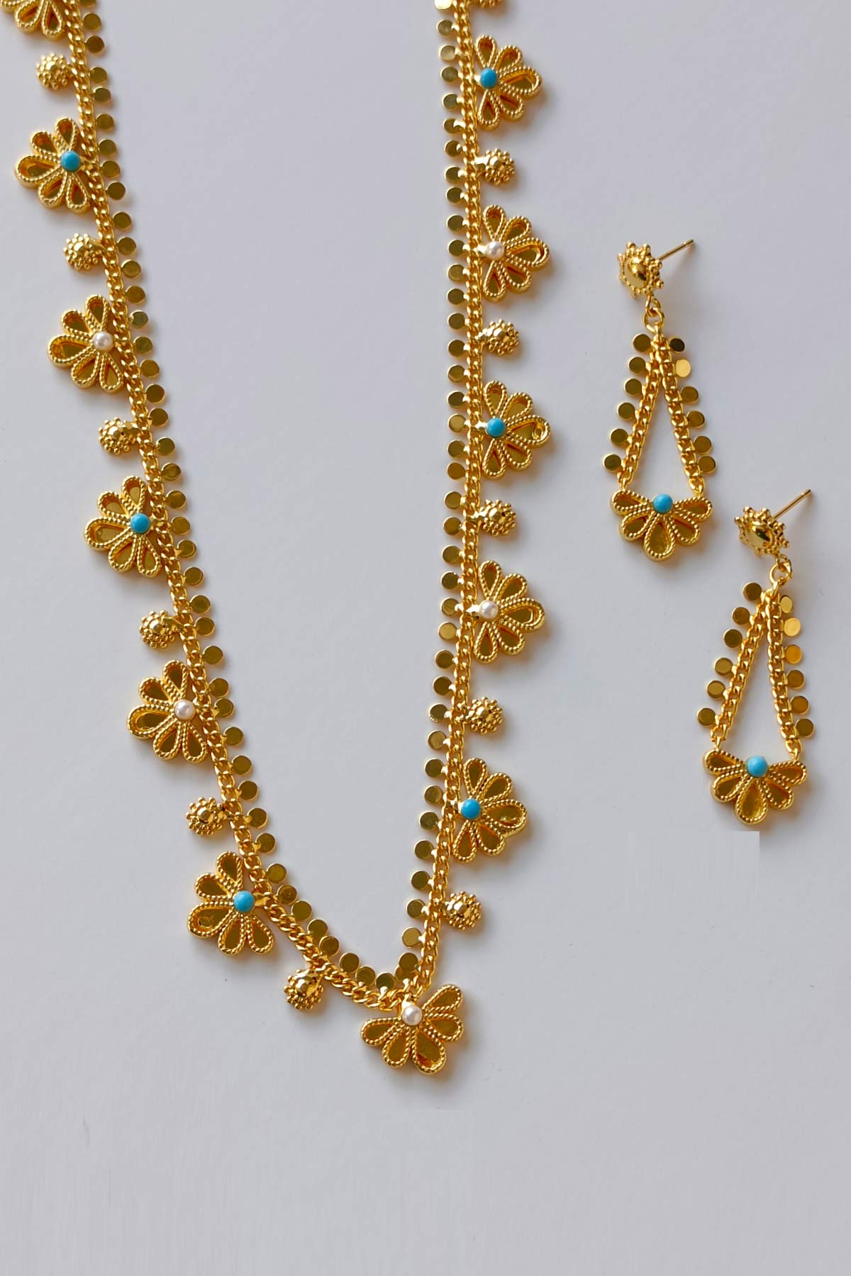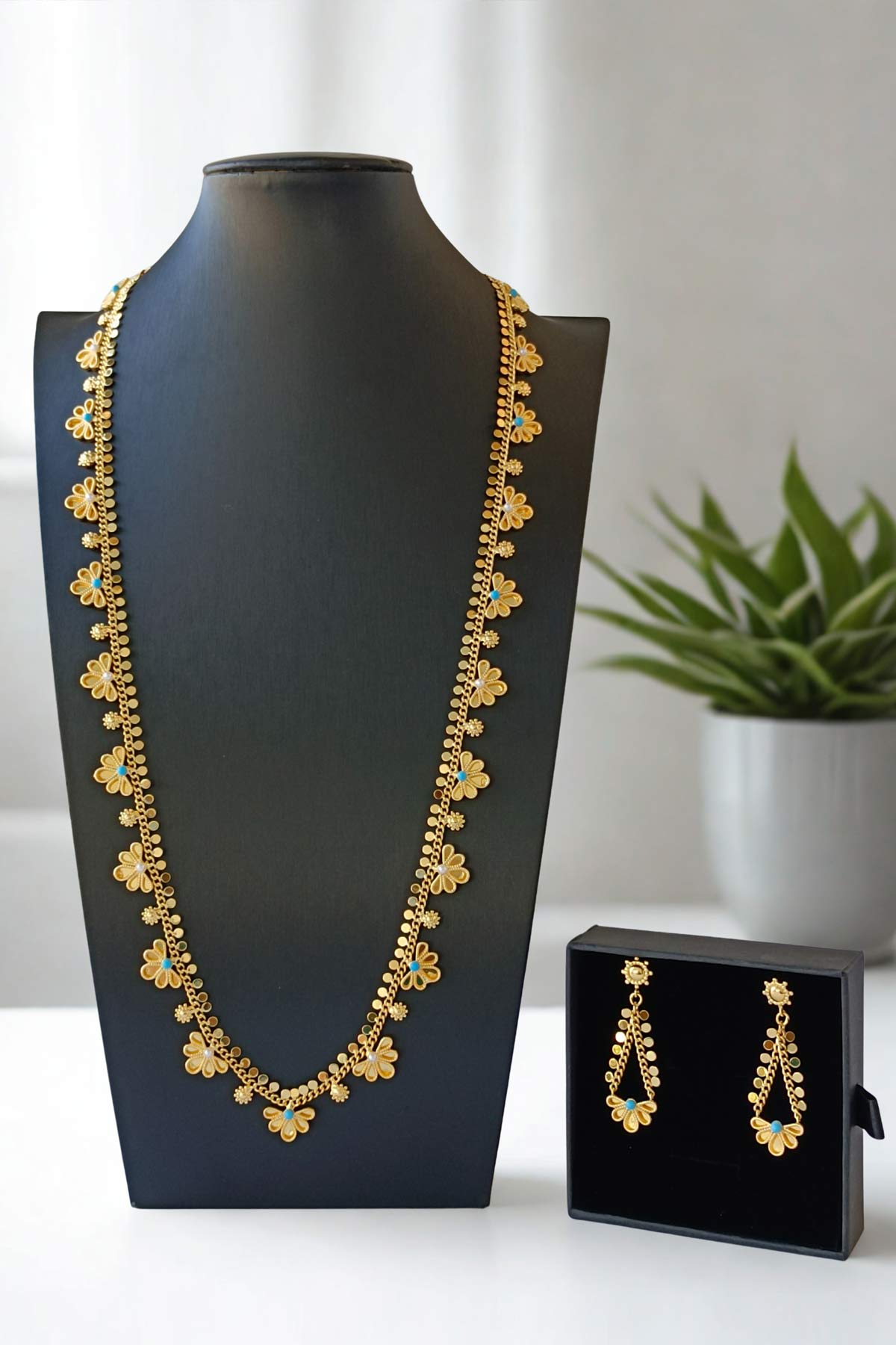 Add a graceful touch of tradition to your look with this beautifully crafted gold-tone garland necklace set featuring delicate floral motifs and soft blue enamel accents. The long necklace showcases a continuous chain of miniature flowers, creating a lightweight yet statement-worthy design that pairs effortlessly with both modern and traditional outfits. The matching drop earrings mirror the same floral detailing, offering a coordinated and elegant finish perfect for festive events, parties, family gatherings, and everyday elegance.